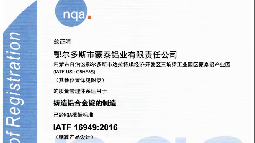 铝硅合金熔铸中试厂乐成获得IATF 16949认证